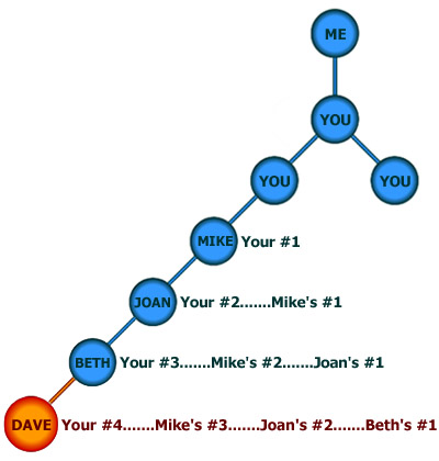 Your first sales team is now complete, and the real exciting part is about to happen. Keep in mind that this "leg" of your organization will continue to grow on its own because people will be looking for their Number 1 team member down through this leg of your organization. This creates strong growth, continuous momentum, and long-term stability. We will now focus on another leg of your organization and repeat the above process while your business grows solid in your first leg. You may be able to complete your first sales team in a week or less. |